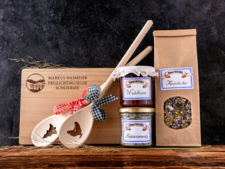 Kochlöffel Holzbrett Wasmeier Wildkräutersalz Fruchtaufstrich Waldbeer Bio Kräutertee